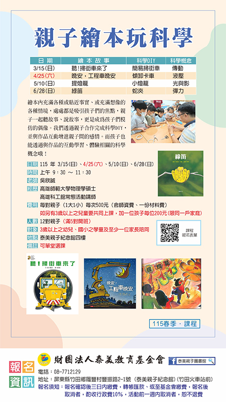 泰美春季課程【親子繪本玩科學】,歡迎大家踴躍報名參加!!